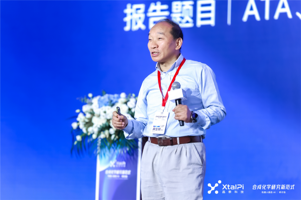 6 月 28 日上午,大會在中國科學院麻生明院士、晶泰科技聯合創始人/首席執行官馬健博士的歡迎致辭中拉開帷幕。麻生明院士以 “ATA、自動化和機器學習” 為題,介紹 ATA 反應(Allenation of Terminal Alkynes)發展的歷程和目前面臨的挑戰,并分享了與晶泰科技合作開發并優化能開展 ATA 反應研究的自動化合成平臺以及平臺應用進展——基于聯合開發平臺獲取更多高質量數據,推進了機器學習方面的實踐,進一步拓展 ATA 反應,以期突破目前面臨的瓶頸,全面實現溫和條件下的 ATA 反應。