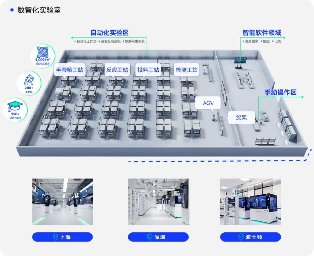 晶泰科技的自動化實驗室采用人機結合模式實現了實驗過程的高度自動化和智能化,通過智能調度系統遠程操控百臺規模自動化工站和 AGV 小車,同時提升實驗過程和物料傳送的效率。