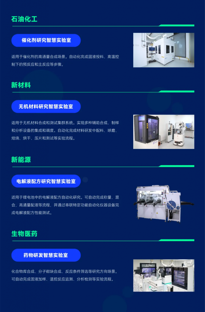 晶泰科技的實驗室智能化自動化解決方案,應用于石油化工、新能源、新材料、生物醫藥等行業。我們提供的自動化產品與服務包含:智慧實驗室一站式建設服務、機器人工作站等,已為客戶落地構建了藥物研發智慧實驗室、催化劑研究智慧實驗室、無機材料研究智慧實驗室以及電解液配方研究智慧實驗室等,特定自動化應用場景的機器人工作站包含 XmartChem??智能合成工作站、XtalComplete??智能結晶工作站、ChemPlus??桌面型固體加樣儀。