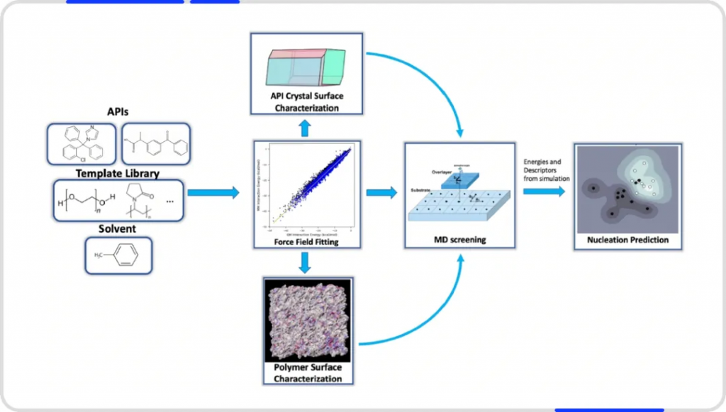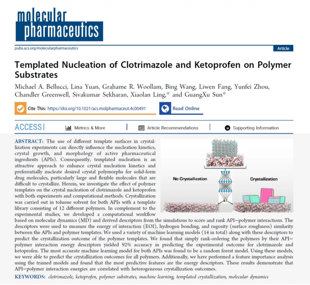 為了解決上文提到的難以調控結晶過程的問題,晶泰科技固態研發團隊與諾華科學家團隊攜手合作,針對模板結晶法進行了深入的創新研究。研究人員首先通過實驗評估了聚合物模板對活性藥物成分(API)結晶動力學的促進作用。隨后,他們利用分子動力學模擬技術,開發了衡量 API 與聚合物之間的相互作用強度的算法并開發了特定的描述符,運用機器學習模型來預測模板結晶的結果。研究結果表明,聚合物模板能夠顯著提升 API 的成核動力學性能,同時,基于分子動力學模擬的相互作用描述符在預測聚合物模板對結晶過程促進效果方面展現出了高度的準確性(準確率可高達 92%),這為精確控制藥物結晶過程提供了全新的思路和方法。