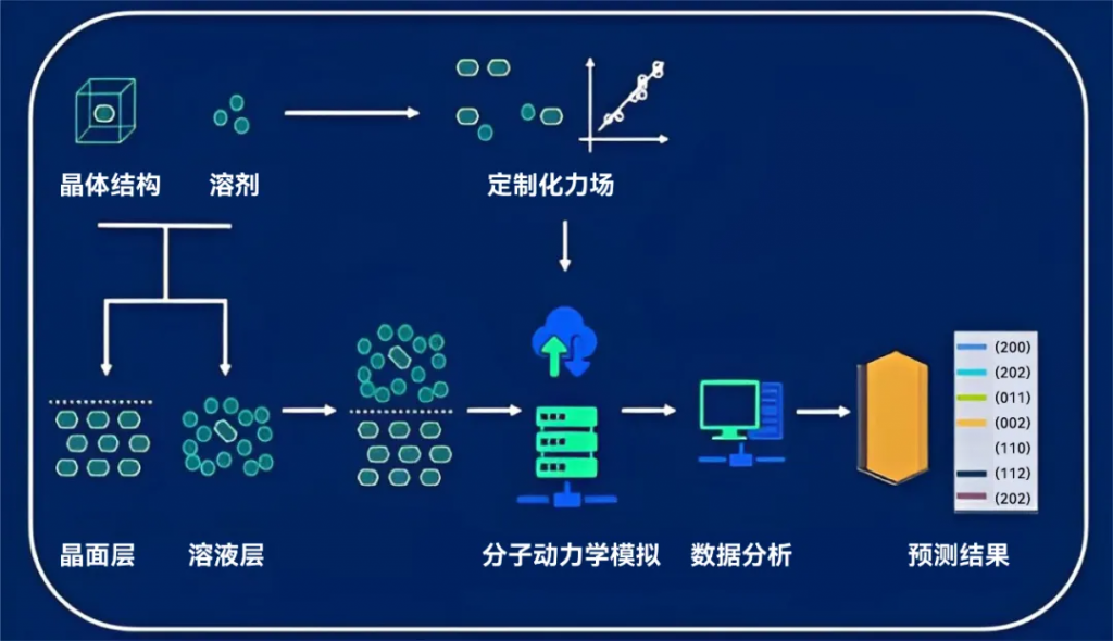 晶泰科技基于計算的晶習預測方法采用定制化力場,利用分子動力學模擬針對給定晶體結構進行批量的晶習預測,通過溶劑種類、過飽和度、溫度等因素探究晶體形貌的可變性與可調控性,可以有效協助實驗科學家更好地選擇結晶條件組合,實現對晶習調控的理性設計,從“普遍撒網”變為“重點培養”,從而降低實驗成本,提升研發效率,加速結晶工藝開發過程,促進降本增效。