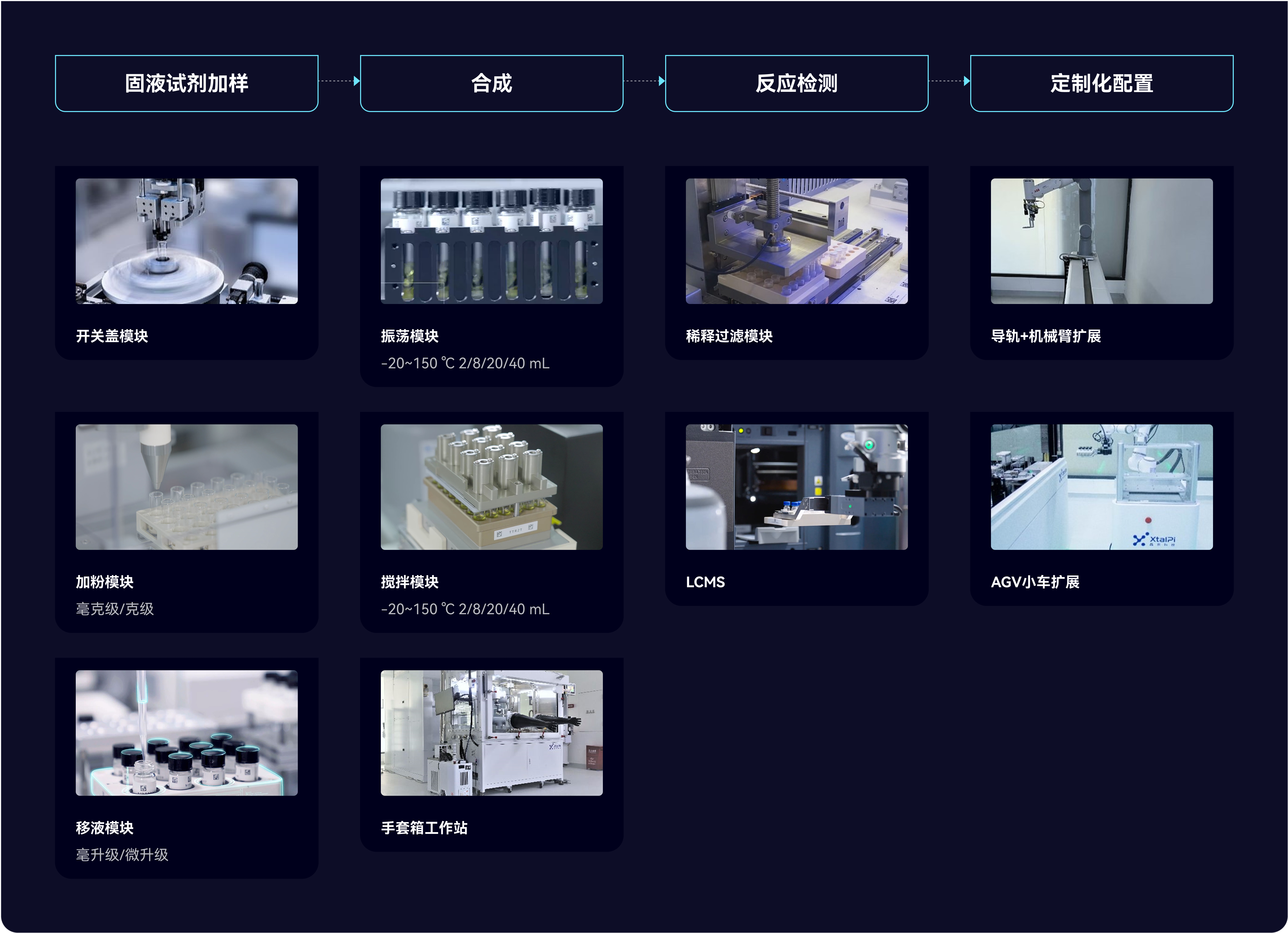根據不同應用場景,兼容不同反應容器,六軸/四軸機器?系統支持集成多種自動化模塊